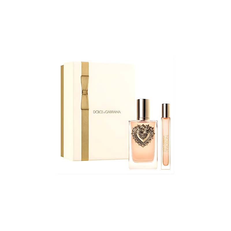 olce & Gabbana Devotion Eau de Parfum 2-Piece Gift Set for women, a celebratory collection that debuted in 2023. This elegant set includes a full-size 100ml (3.3 oz) Eau de Parfum spray and a convenient 10ml (0.33 oz) travel spray, both featuring the iconic Sacred Heart seal. The fragrance is a gourmand Amber Vanilla composition that opens with the bright, sugary zest of candied lemon, transitions into a delicate heart of orange blossom, and settles into a warm, creamy vanilla base. Designed to radiate beauty and sophistication, this duo is perfect for layering the scent at home and maintaining it throughout the day while on the go.